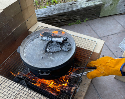 「石焼き芋」用の石をダッチオーブンで熱します。