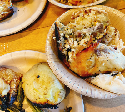前日より、若鶏の丸鶏を掃除して、お腹にガーリックピラフをつめ