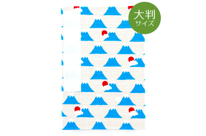 大判サイズ(横12cm×縦18cm)の御朱印帳。神社や寺院でご朱印を頂く帳面です。表紙は日本の最高峰、大人気「富士山」のプリント。キナリ地にブルーの富士山とご来光をイメージした可愛いデザイン。お色違いもございます。御朱印帳の紙は日本の多くの神社仏閣の御朱印帳で使用されております白色の和紙です。伝統技術を持つ職人が1冊1冊、手作りで蛇腹の御朱印帳を製本しております。