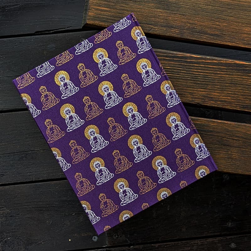 優しく微笑む大仏様がモチーフになっています。大仏様の後ろには金色の後光が輝いています。大きな生地を裁断しているため一冊一冊異なった柄の出方となっております。個性豊かな特別な一冊としてお楽しみください。