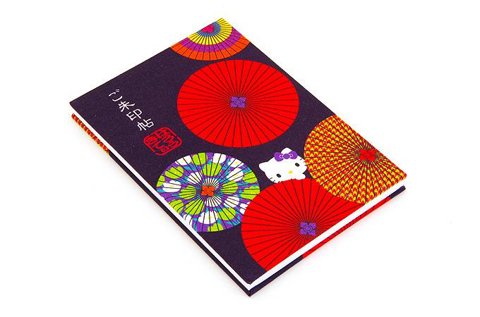 ハローキティ御朱印帳シリーズ第二弾。紫地に鮮やかな番傘模様。粋でモダンな色柄に紫リボンのキティちゃんの御朱印帳。