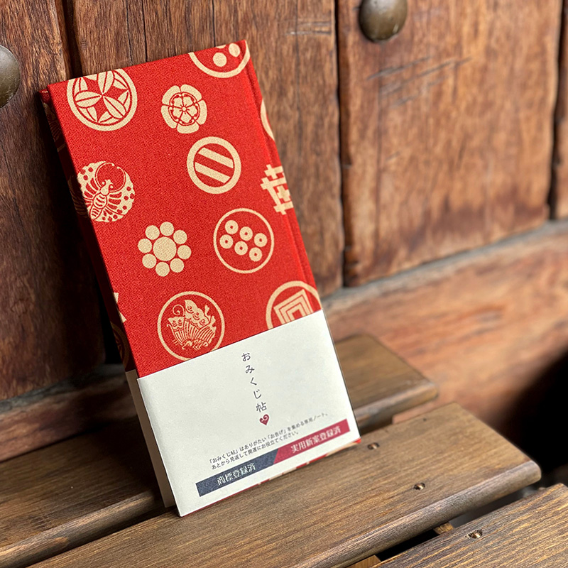 総柄の生地をカットして表紙を製作しておりますので製品によって柄の出方が違います。画像や説明文に掲載されております絵柄が含まれていない場合もございますので予めご了承ください。近年では神さま仏さまからのお告げとして、おみくじを持ち帰り、大切に保管収集する楽しみ方があります。「おみくじ帖®」はありがたい「お告げ」を集めるためのノート型ホルダーです。糊やテープを使わず保管でき、日付、社寺名、おみくじの結果、心覚え等を書き込めます。健康運、仕事運、学業運、恋愛運、金運など後から見返して開運にお役立てください。こちらの「おみくじ帖®」は特許登録済、商標登録済の日本初、おみくじ保管専用の帳面です。表紙は戦国武将の旗印に据えられていた家紋モチーフのプリントです。男性にもおすすめの粋なおみくじ帖®です。お色は朱色。お色違いもございます。おみくじ帖®の紙は日本の多くの神社仏閣のご朱印帳で使用するクリーム色の和紙です。伝統技術を持つ職人が1冊1冊、手作りでおみくじ帖®を製本しております。持ち運びや保管には関連アイテムのカバーやバンド、御朱印帳袋(ポーチ)や御朱印帳しおりなどもお使いいただけます。